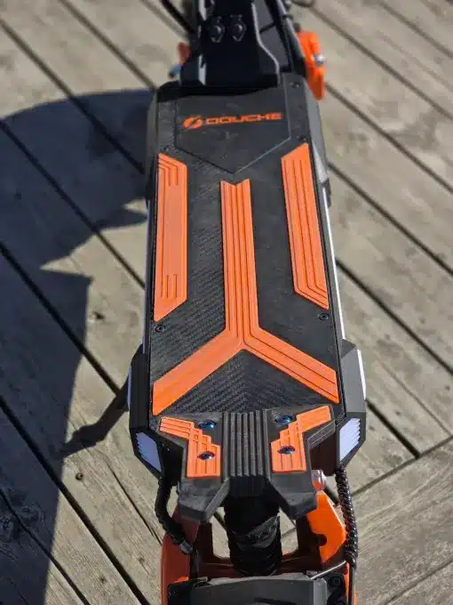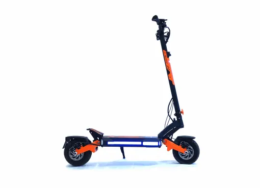 Designen är både tuff och genomtänkt: svart grund med orangea detaljer, en sportig display och LED-belysning som syns både dag och natt. Scootern är dessutom utrustad med stötdämpare både fram och bak, vilket ger en jämn och bekväm färd även i högre hastigheter eller på ojämnt underlag.